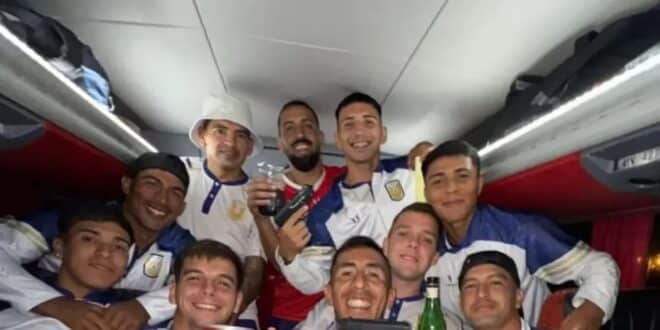 En el micro de vuelta desde Salta, el plantel decidió que era buena idea retratarse entre botellas y fierros de plástico. Bruno Medina y Felipe Estrada posaron como si fueran extras de una serie de Netflix sobre el conurbano, acompañados por una banda de soporte que incluye a Flores, Cisneros, Barrera, Ovejero y el arquero suplente Tonini.